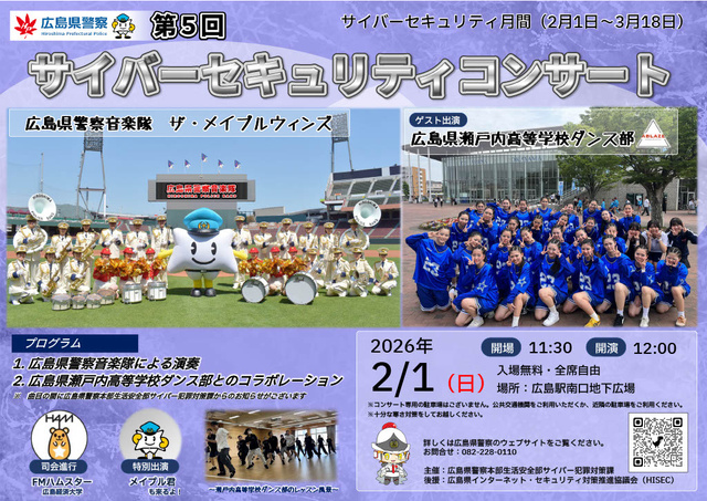 2月1日~3月18日はサイバーセキュリティ月間。当日は、広島県警音楽隊ザ・メイプルウィンズによる演奏、広島県警察本部生活安全部サイバー防犯対策課からのお知らせ、広島県瀬戸内高等学校ダンス部とのコラボレーションを予定。司会はFMハムスター(広島経済大学)、特別出演でメイプル君もやってくる。
