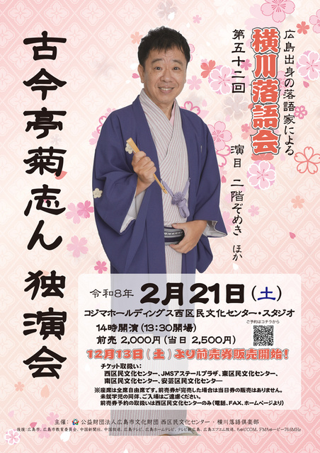 東京・浅草で活躍する真打落語家4名による独演会シリーズ。第52回は広島市出身の古今亭菊志んさんによる独演会。今回の演目「二階ぞめき」は古今亭志ん生さんの十八番で、大河ドラマ「べらぼう」でも話題となった吉原を扱った落語。迫力ある話芸を会場で堪能しよう。