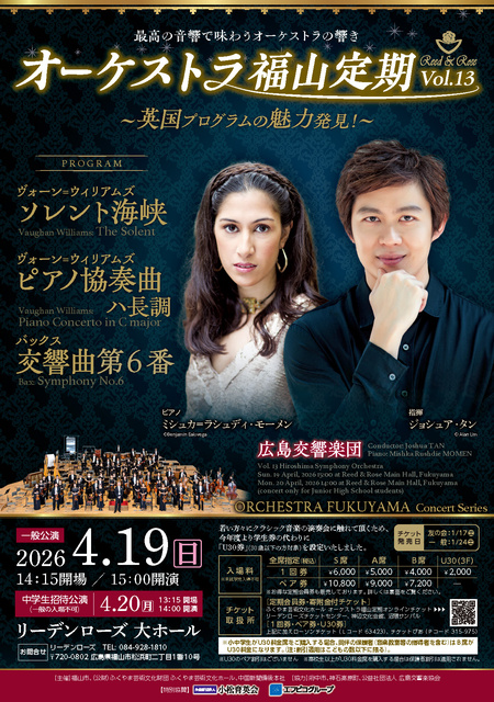 リーデンローズが開催するオーケストラ福山定期に、広島交響楽団が登場。最初から最後までイギリス作品のみで構成された、深みのある英国プログラムを届ける。指揮はジョシュア・タン、ピアノはミシュカ=ラシュディ・モーメン。曲目は、ヴォーン=ウィリアムズ:ソレント海峡、ヴォーン=ウィリアムズ:ピアノ協奏曲ハ長調、バックス:交響曲第6番を予定。 ※未就学児入場不可