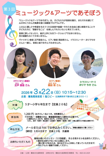 「ミュージック&アーツであそぼう」は、子どもたちが音楽を聴き、またそれを感じて心の中にうかんだ風景を描く体験型プログラム。ヴァイオリン奏者の正戸里佳さん、ピアノ奏者の岡田将さん、イラストレーターのおりでちせさんと一緒に、音楽と絵であそんでみない? 対象は5才~小学6年生、定員20名。先着順。3月8日までにメール又はFAX(0823-70-8079)で申し込み。詳細は蘭島文化振興財団HP参照。