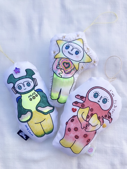 広島出身、在住の陶芸作家・浅野真希江(ハロー!愛の庭)による陶器でできた祈りの人形「Praylings」のイラストを使って、彼らの祈りが込められたお守りを制作するワークショップ。3種類の「Praylings」が描かれた布の中から好きなものを選び自由に色を塗ったりデコレーションしたりしてストラップと一緒に縫い閉じる。小さなこどもにはあらかじめ縫い閉じたものを用いて飾りつけの工程を体験してもらう。