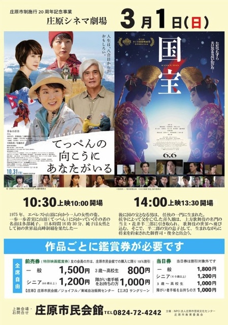 庄原市制施行20周年記念事業として、庄原シネマ劇場を開催。午前は「てっぺんの向こうにあなたがいる」、午後は「国宝」が上映される。