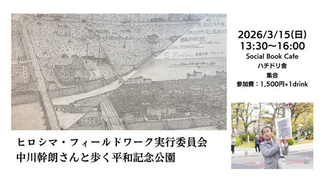 ハチドリ舎に集合し、30分程度お話を聞いた後、約2時間のフィールドワークに出発する。今回は、原爆投下で壊滅した広島市中心部の街並みを細密な鉛筆画に描き残し、2011年に画集「消えた町 記憶をたどり」を発刊した被爆者の森冨茂雄さんの絵と景色を重ねながら、平和記念公園周辺を歩く。