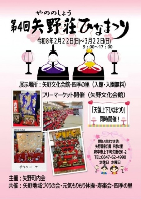 矢野文化会館と矢野温泉公園四季の里にたくさんのおひな様が展示される。近隣の「天領上下ひなまつり」と併せて楽しもう。
