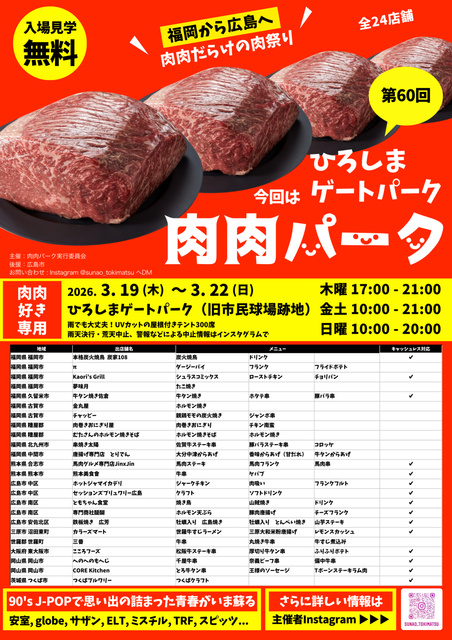 お肉人気店全24店舗が大集合! 肉肉だらけの肉祭り 肉肉パーク ひろしまゲートパーク。各店ご自慢のお肉料理を提供。中には肉肉パーク限定メニューも。