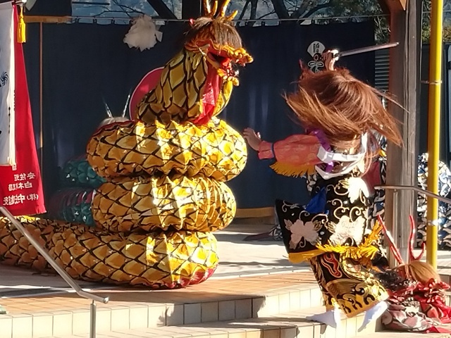 春の公園で迫力ある神楽の上演が行われる。出演は宮崎神楽団。