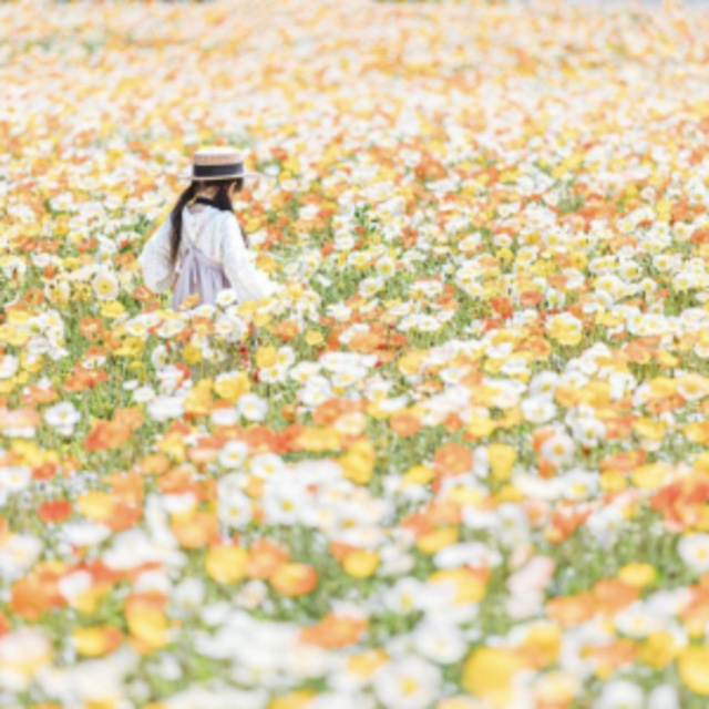 赤、白、黄と、色とりどりに丘一面にポピーが咲き誇る。つぼみは、最初は下向きで表面に毛が生えており、咲くときには顔を上げ、2つに割れて花が出てくる。その風情がなんとも不思議。