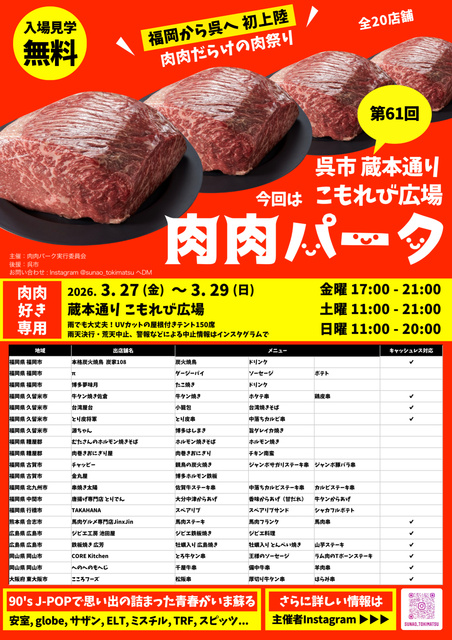 呉市初開催!お肉人気店全20店舗が大集合!各店自慢のお肉料理を提供する。中には肉肉パーク限定メニューも。ぜひ行ってみよう。