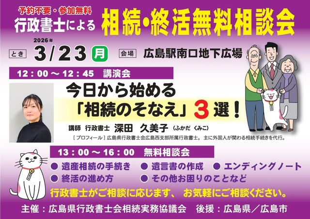 行政書士による相続・終活無料相談会を広島駅南口地下広場で行う。ステージにて行政書士の深田久美子氏を迎え、相続・終活に関する講演会を開催。また。行政書士による相続・終活無料相談会も実施。気軽に相談に出かけてみよう。