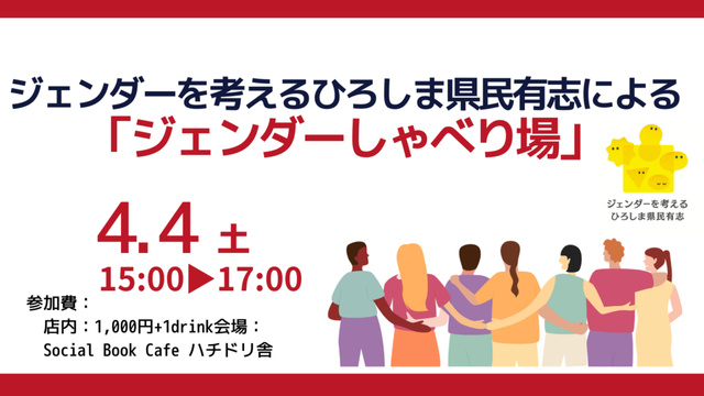 ジェンダーを考えるひろしま県民有志が参加者と一緒に、ジェンダー平等、性差別や性暴力、セクハラやモラハラ、日々のモヤモヤ…等についておしゃべりする会。気軽におしゃべりしよう!