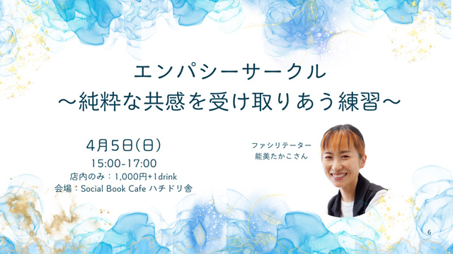 共感サークルとは、集った人の一人が自分のエピソードを話す「話し手」となり、それ意外の人全員が「話し手の感情やその奥にある大切にしたいこと(ニーズ)に焦点を当てながら聴く「聴き手」となるトーキングサークル。『話し手』と『聴き手』は、交代してはすすめる。話し合いでもなく、意見交換でもない。ただ聴くという事がどれだけ癒しの力を持っているかを体験してみよう。