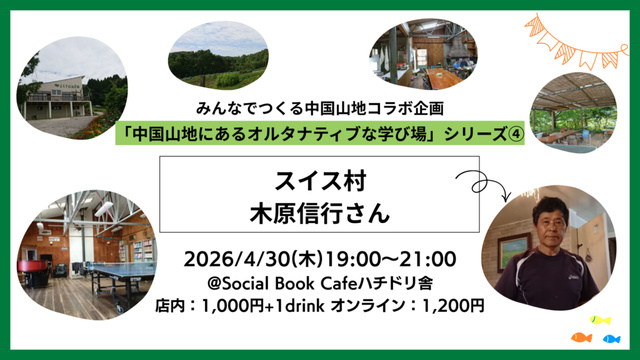 「みんなでつくる中国山地」とコラボ企画! 2026年のテーマは「中国山地にあるオルタナティブスクール」。今回のゲストは広島県庄原市で全寮制フリースクール「スイス村」を運営してきた木原信行さん。理想の教育の場を求め、教員を辞めて山奥にスイス村を手づくりで開設。30年の活動を続ける中での失敗談も含めた豊富な経験、見てきた子どもたちや親の変化などを、北村浩司さんを聞き役に、対談形式でお話ししてもらう。