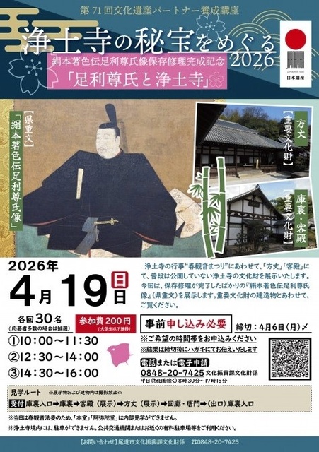 広島県重要文化財「絹本著色伝足利尊氏像」の修理完了を記念し、特別公開を開催! 浄土寺に伝わる尊氏ゆかりの品々とともに、普段は見ることのできない秘宝を展覧。歴史ある重要文化財の建造物で、特別なひとときをぜひ楽しもう。要事前申し込み。