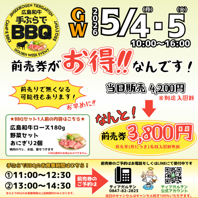 神石高原ティアガルテンのゴールデンウィークのイベント。手ぶらで広島和牛のBBQが出来る手軽さで毎年評判。BBQの他に、音楽ステージや宝探しゲーム、飲食屋台も出店。BBQは1日の数に限りあり。電話予約を推奨。LINEアカウントからも予約可。