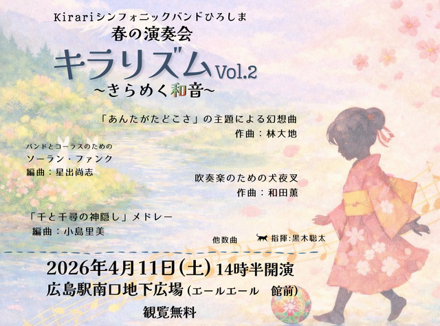 広島市を活動拠点とする吹奏楽団「Kirariシンフォニックバンドひろしま」による春の演奏会“キラリズムVol.2 〜きらめく和音〜”を開催。日本を代表するアニメの名曲や、思わず掛け声をかけたくなるあの民謡など、世代を問わず楽しめるステージを、吹奏楽のサウンドでお届けする。