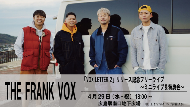 【THE FRANK VOX】「VOX LETTER 2」リリース記念フリーライブ~ミニライブ&特典会~を開催。イベント当日16時30分から予約販売を開始。全額前金で予約した人に、先着で『整理番号入り優先入場券』と『特典券』『特典』がもらえる。イベントの詳細・注意事項はHPを参照。