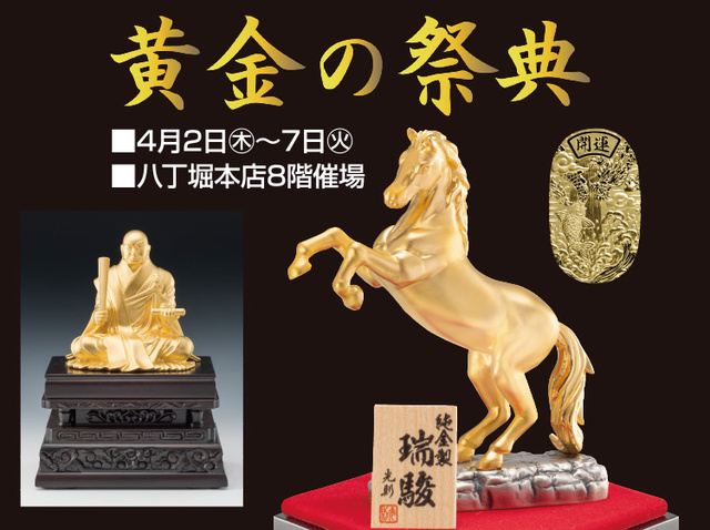 まばゆい光を放ちながら駆け出しそうな駿馬や迫力ある不動明王、松の盆栽などをかたどった純金の置物をはじめ、仏具やきらめくジュエリーなど、煌めく豪華絢爛な黄金の魅力を、会場で存分に堪能しよう。4月4日(土)・5日は、金工作家 新井創永氏による鍛金模様付け体験会も開催(要申込・参加費16,500円)。