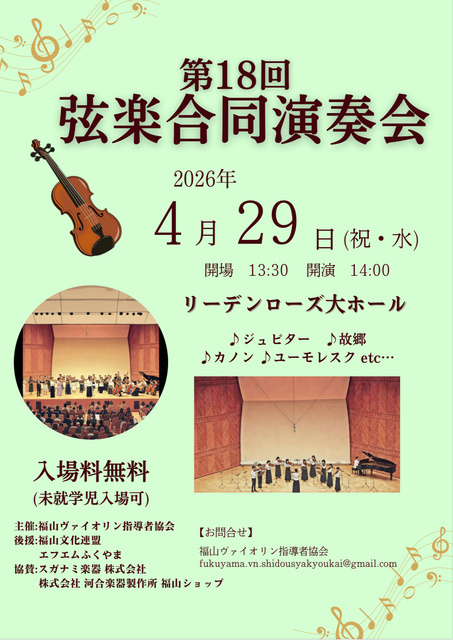 福山ヴァイオリン指導者協会会員の生徒(未就学児から80代まで)が集まり、それぞれ習っている弦楽器で、大きな舞台での演奏を楽しむ演奏会。ヴァイオリン・ヴィオラ・チェロ・コントラバスの生徒達が、日頃の練習の成果を披露。パッヘルベルのカノン、ジュピター、ユーモレスク、アイネクライネナハトムジークなどを演奏。