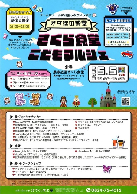 2024年12月にオープンした、交流拠点施設『食彩館しょうばら ゆめさくら』内にある食堂で、こどもの日に「オタ活の殿堂 さくら食堂こどもマルシェ」を開催。ゲーム好きが楽しめる企画のほか、シールブースではシール交換会・3Dシール作り・シール販売を実施。さらに13歳と10歳の姉妹デュオによる、アコースティックギターの弾き語りライブもあり。飲食ブース・キッチンカー、雑貨、占い&ワークショップもたくさん!