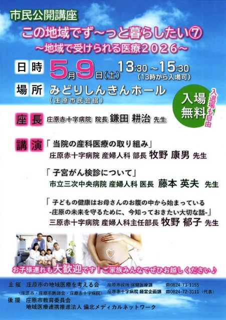 庄原市の地域医療を考える会主催の市民公開講座。座長は庄原赤十字病院 院長の鎌田耕治先生。講演は、庄原赤十字病院 産婦人科部長 牧里予康男先生「当院の産科医療の取り組み」、市立二次中央病院 産婦人科医長 藤本英夫先生「子宮がん検診について」、三原赤十字病院 産婦人科主任部長 牧里予有田子先生「子どもの健康はお母さんのお腹の中から始まっている -庄原の未来を守るために、今知っておきたい大切な話-」。